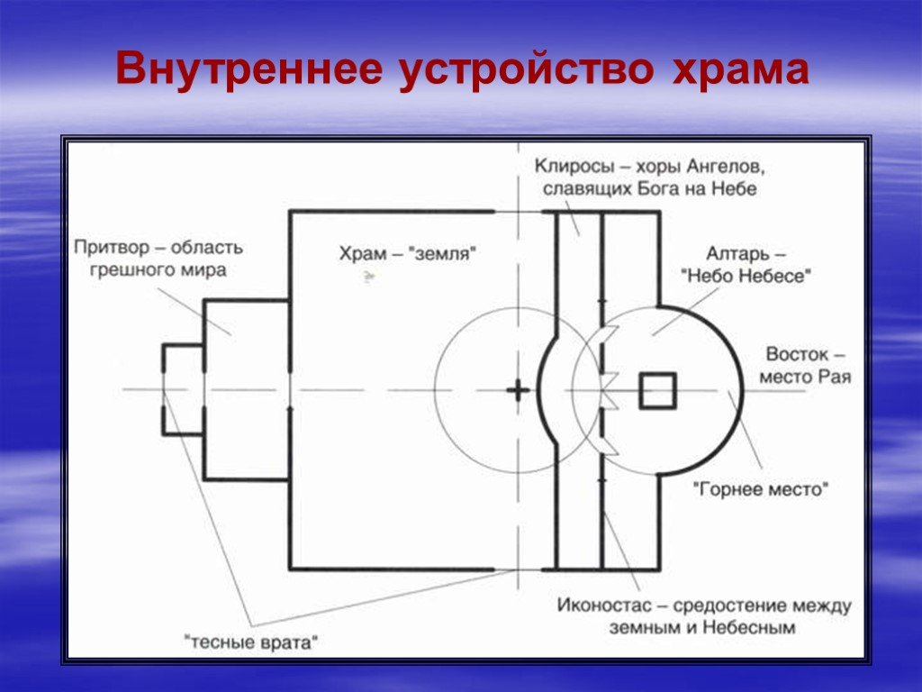 Объяснение духовно-символического смысла этого обычая мы находим в Священном Писании. Спаситель мира назван Востоком (Лк.1:78). Св. апостол Иоанн Богослов говорит, что Бог есть свет (1Ин.1:5), а свет приходит с востока. Через св. пророка Малахию Господь называет Сына Своего Солнцем правды (Мал.4:2). Псалмопевец Давид призывает все страны воспевать Господа, восшедшего на востоке: Царства земная, пойте Богу, воспойте Господеви, возшедшему на Небо небесе на востоки (Пс.67:33-34). В конце времен Господь наш Иисус Христос вновь явится на Землю. По слову св. Евангелия: как молния исходит от востока и видна бывает даже до запада, так будет пришествие Сына Человеческого (Мф.24:27).